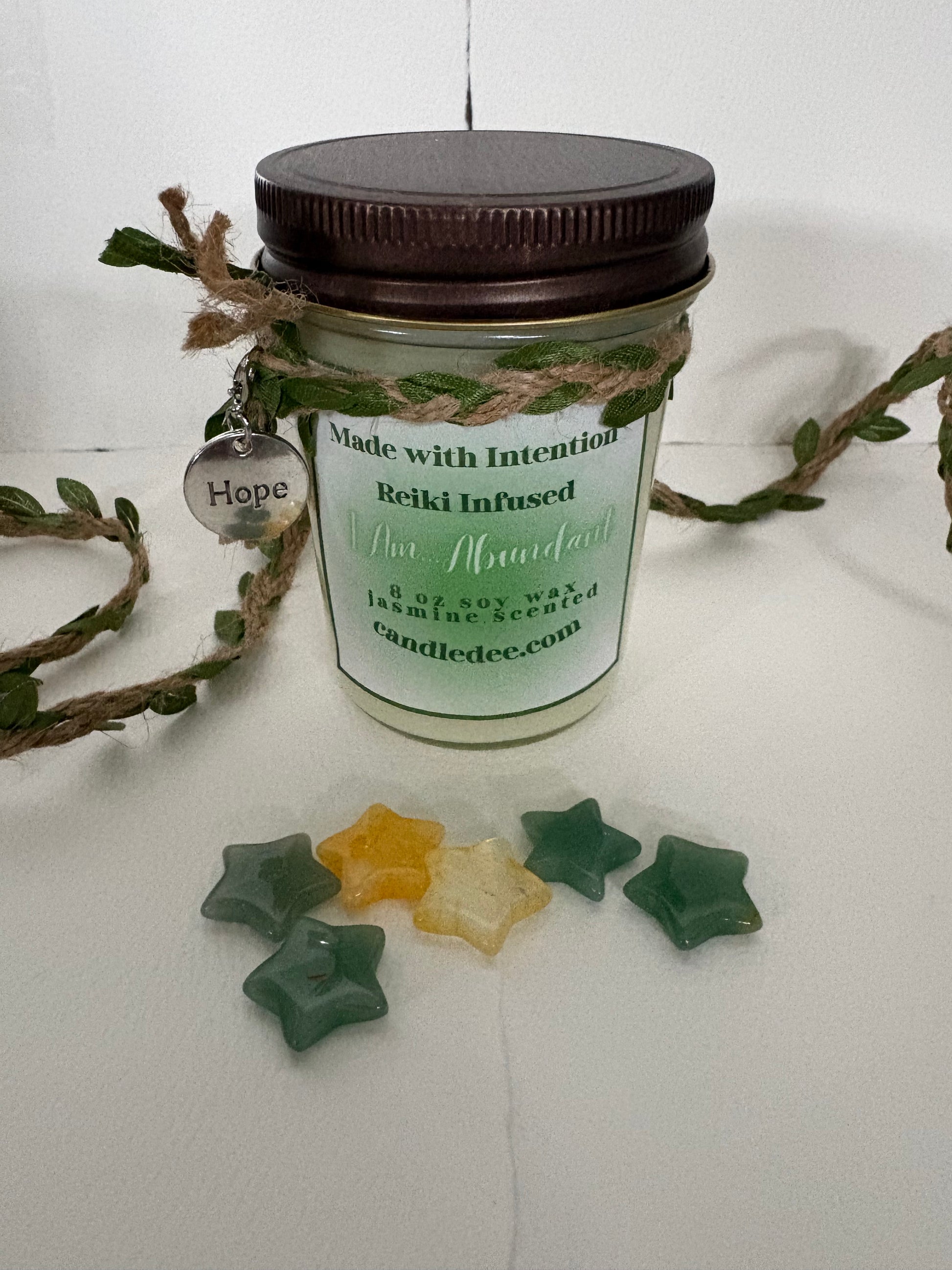 Ignite your abundance with our "I am... abundant" candle! Infused with the purest jasmine scented oil and with clear quartz, aventurine, malachite. Including jasmine, and chrysanthemum flowers for a vibrant and prosperous feel. Surround yourself with the beauty and scent of abundance.