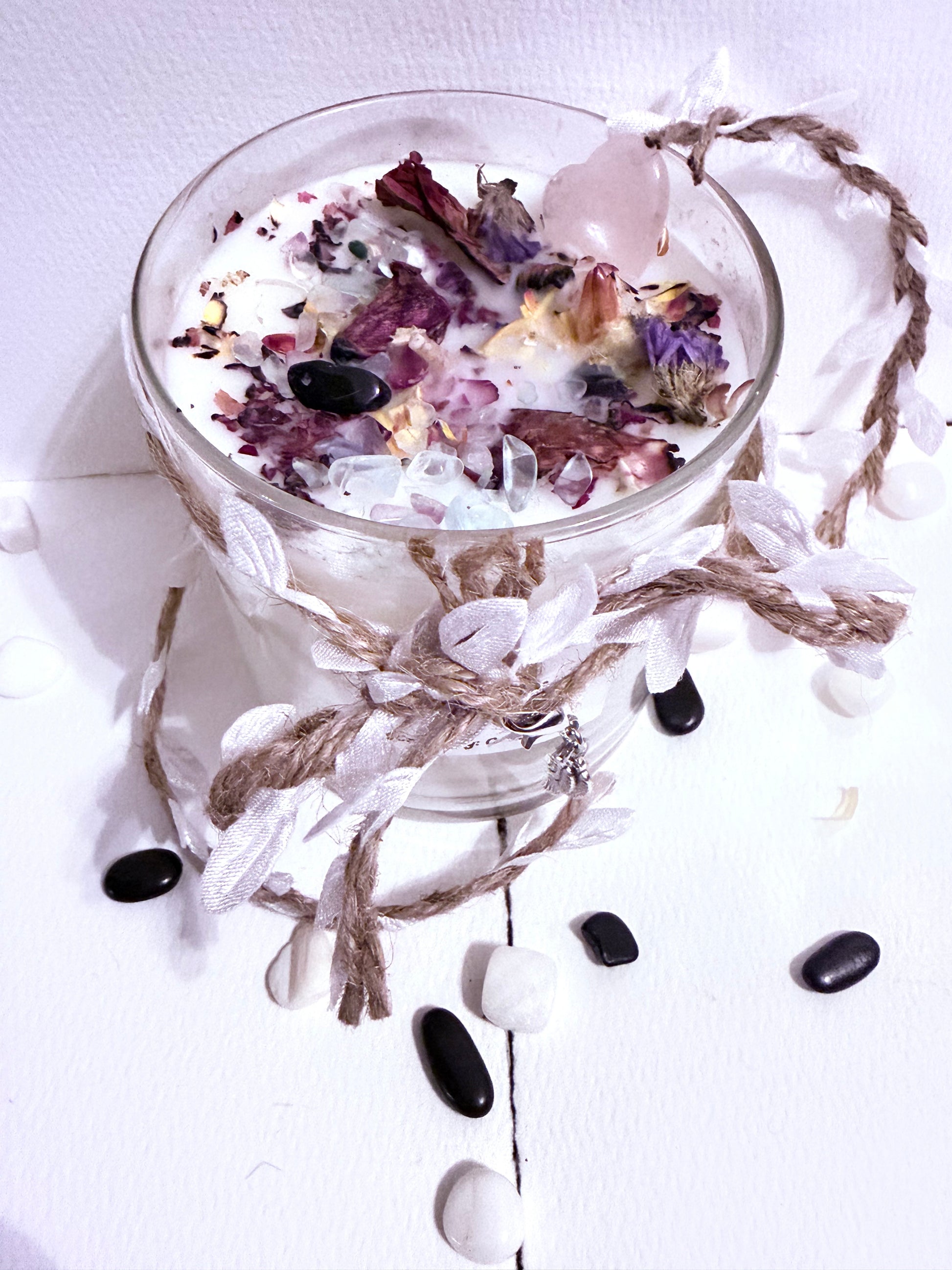 Delicately adorned with rose petals, chrysanthemums, and "Don't Forget Me" flowers, this candle serves as a tender reminder of enduring love. An angel wing charm and a Rose Quartz heart complete the piece, symbolizing eternal connection and compassion.