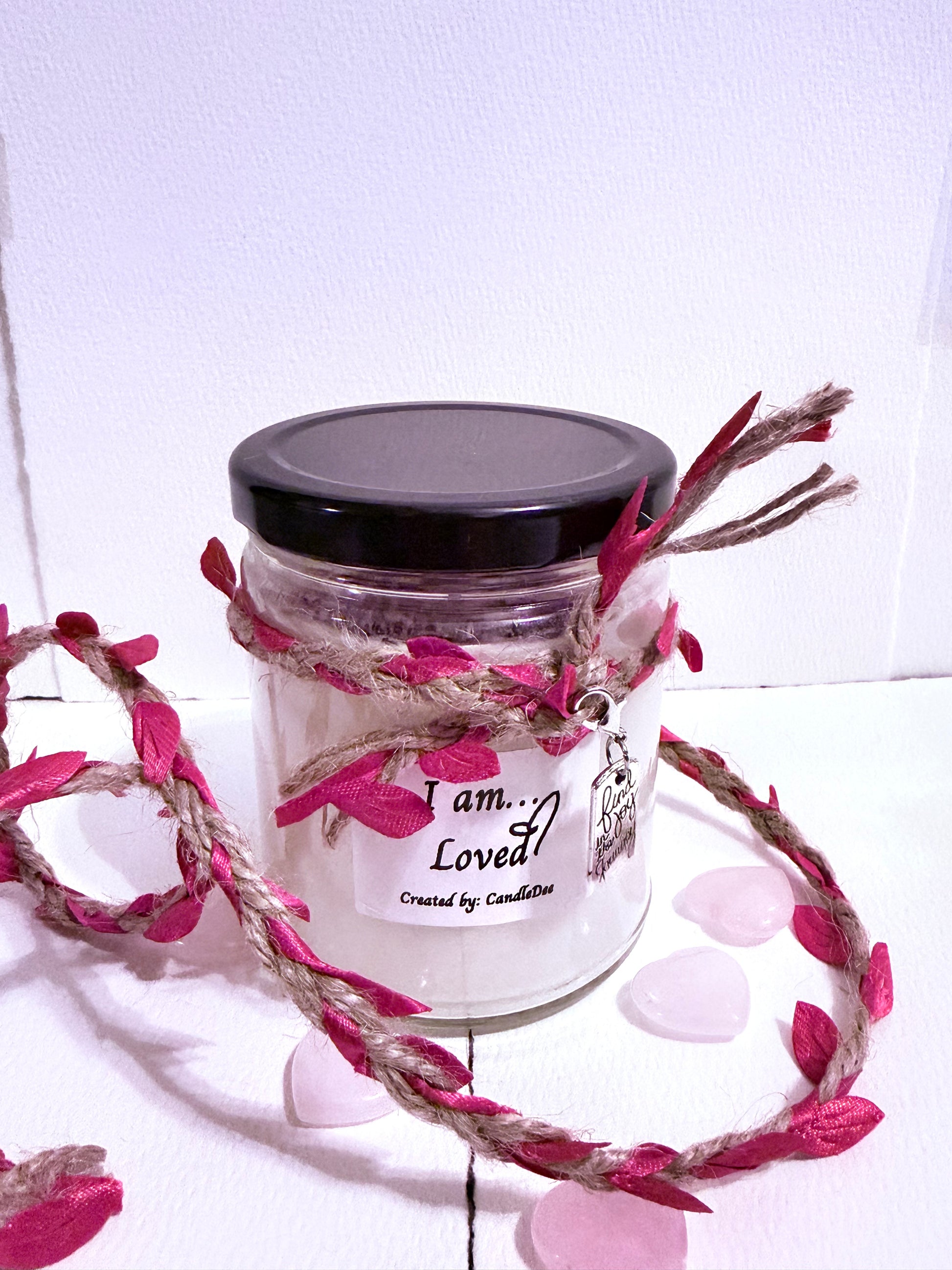 Celebrate love with "I am...Loved"! Infused with rose oil, this candle will fill your space with a self-aware aroma. Adorned with rose quartz, aventurine, and garnet gemstones, and rose petals, this candle is a symbol of love and passion. A touch of pink glitter adds a touch of magic.